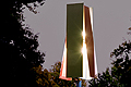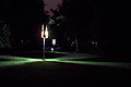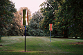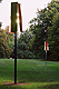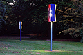 Standort 2 SEMAFOR Siegfried Kreitner Anachronistisch muten die Instrumente der Kommunikation an, die Siegfried Kreitner aufgestellt hat. Zwei identische Masten mit Aufsätzen, die sich in unterschiedlichem Tempo um ihre eigene Achse drehen. Ihre beweglichen Flügel verschieben sich dabei leicht und schicken das Licht im Innern in regelmäßig unregelmäßigen Abständen nach außen. Bis weit in das 19. Jahrhundert wurden solche Semaphoren zur Übermittlung von Nachrichten eingesetzt. Mit ihnen ließen sich ganze Texte als optische Signale von einem Apparat zum nächsten weiterleiten. Eine Botschaft von Paris über Berlin nach Königsberg brauchte so weniger als einen Tag – klare Sichtverhältnisse vorausgesetzt. Heute ist diese Technik ein Fall für das Museum. Oder für Künstler wie Kreitner, der die Semaphoren zu kinetischen Skulpturen uminterpretiert. Dank der Bewegung der beiden Objekte gerät das Licht ebenfalls in Bewegung. Den Park beleuchtet es allerdings kaum; stattdessen erfüllt es das Innere der beiden Aufsätze und macht die Installation „Semafor“ zu einem strahlenden Signal. Wer von ihr angelockt wird, der kann beobachten, wie die beiden Elemente der Arbeit miteinander korrespondieren. Und sich vorstellen, diese poetische Reflexion über die Sprache des Lichts sei zugleich der Anfang einer möglichen Kommunikationskette, die Botschaften weit über den Ausstellungsort hinausträgt. Text: Christiane Meixner