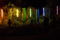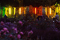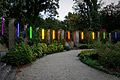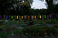 Standort 4 EIN REGENBOGEN FING SICH IM ROSENGARTEN Waltraut Cooper An wenigen Stellen im Tiergarten zeigt sich die Natur so kultiviert wie im Rosengarten: ein Ort, der wie ein Ornament im Grünen liegt und der Natur mit Wegen und Rabatten ein strenges architektonisches Gerüst oktroyiert, wie es der Rosenzüchter Peter Lambert 1909 ersonnen hat. Die österreichische Künstlerin Waltraut Cooper ergänzt und durchbricht diese historische Ordnung mit ihrem „Regenbogen“ – zwei scheinbar konträre Impulse in einer Arbeit. Da ist zum einen die Reihung ihrer Lichtelemente. In regelmäßigen Abständen werden Leuchtstoffröhren an der Arkade angebracht, die den Rosengarten nun ebenfalls strukturieren und den Weg durch den Garten weithin sichtbar machen. Wie ein rhythmischer Akzent legt sich der Farbverlauf über die gärtnerischen Maßgaben, stimmt manchmal mit ihnen überein und läuft den gestalterischen Absichten andernorts zuwider. Beim Farbkonzept ihrer Installation orientiert sich Waltraut Cooper am Verlauf eines echten Regenbogens. Der Besucher durchwandert die Arkade vom warmen Rot über lichtes Gelb und kühles Blau bis zum satten Violett (oder umgekehrt) und sieht sich von Farbtönen umhüllt, mit denen vielfältige Stimmungen assoziiert werden. Aus der Gesamtheit der Spektralfarben erwächst eine atmosphärische Lichtarchitektur, die dabei auch abstraktere Gedankenspiele zulässt – an Arkadien etwa als dem irdischen Paradies. Nicht zuletzt gilt der Regenbogen als ein Friedenssymbol, und auch diese Bedeutungsebene spielt in der Arbeit von Waltraut Cooper eine wichtige Rolle. Text: Christiane Meixner