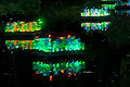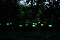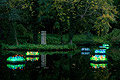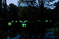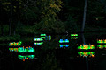 Standort 6 QUANTENBLUMENBALLETT Francesco Mariotti Farbig schimmert das Wasser, auf dem wundersame „Quantenblumen“ durch die Nacht gleiten. Fünfzehn schaukelnde Gebilde, die sich wie ein leuchtender Teppich auf dem See verteilen und dort für eine Weile ankern. Von weitem sehen sie aus wie kleine Dschunken. Von nahem bekommen sie schärfere Konturen und lassen sich dennoch nicht identifizieren. Wer würde auch auf die Idee kommen, dass die schwimmenden Inseln von Francesco Mariotti aus einfachen, zusammengedrückten Plastikflaschen bestehen? Zumindest nachts sieht man es nicht, wenn die zahllosen Leuchtdioden das „Quantenblumenballett“ zum Strahlen bringen. Tagsüber enthüllt sich die ganze Profanität der Installation. Ein Produkt aus Recyclingabfall, der dank raffinierter Technologie allerdings nicht bloß ästhetisch aufgewertet wird: Die künstlichen Materialien fügen sich so selbstverständlich in die Landschaft, als sei die Arbeit eine betörende Inszenierung der Natur. Ein Paradox, das sich scheinbar ausschließende Gegensätze zusammenbringt und zu einem wirkungsvollen Bild vereinigt. Mit verblüffend simplen Mitteln, die die Schönheit der Umwelt unterstreichen – ausgerechnet mit Plastikmüll, der längst zur globalen Plage geworden ist. Mit solchen Aspekten spielt Mariotti, der den Betrachter ästhetisch verführt und ihn zugleich auf den latent gefährdeten Planeten aufmerksam macht. Vor allem aber zeigt er, dass es etwas wie die Essenz des schönen Scheins gibt: Sie wird im „Quantenblumenballett“ sichtbar. Text: Christiane Meixner