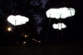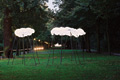 Standort 11 JAPANISCHER WOLKENGARTEN Kyoko Kurihara Ihren „Japanischen Wolkengarten“ vergleicht Kyoko Kurihara mit einem traditionellen Steingarten, der täglich von japanischen Mönchen geharkt wird. Dank dieser meditativen Übung legen sich die Kiesel in immer neuen Formationen um die Steine, deren feine Unterschiede allerdings nur dem auffallen, der sich viel Zeit für eine Betrachtung nimmt. Eine ähnliche Metamorphose durchläuft die Installation der Künstlerin. Ihre Wolken aus festem, gewachstem Japanpapier sind wie die Steine das feste, unveränderliche Element im Garten – bloß dass man hier nicht konzentriert zu Boden, sondern nach oben schaut. Zwischen den halbtransparenten Papierobjekten ändert sich der Himmel mit jeder Minute: Mal scheinen die Sterne klar, dann verschwimmen sie hinter dunstigen Nebelvorhängen. Mit den Mondphasen wechselt das nächtliche Licht, und selbst am Tag bilden die echten Wolken mit den von der Künstlerin gestalteten Objekten ständig andere Konstellationen. Fragile Bilder, die es nur für den Moment gibt. Die Wolken auf Stelen bieten Schutz vor Sonne oder Regen. Gleichzeitig schimmern sie selbst in verschiedenen Farbtönen. Tagsüber verwöhnt Kyoko Kurihara das Auge mit einem warmen, nachts konfrontieren sie es mit kaltem Licht. Der Wechsel zwischen beidem vollzieht sich so unmerklich, dass man ihn kaum wahrnehmen kann. So fügt sich das Kunstwerk nahezu perfekt in die Landschaft und setzt auf die langsame Wahrnehmung – ein Ort, der vergessen lässt, welches Tempo den urbanen Alltag sonst bestimmt. Text: Christiane Meixner